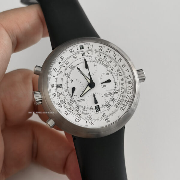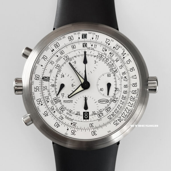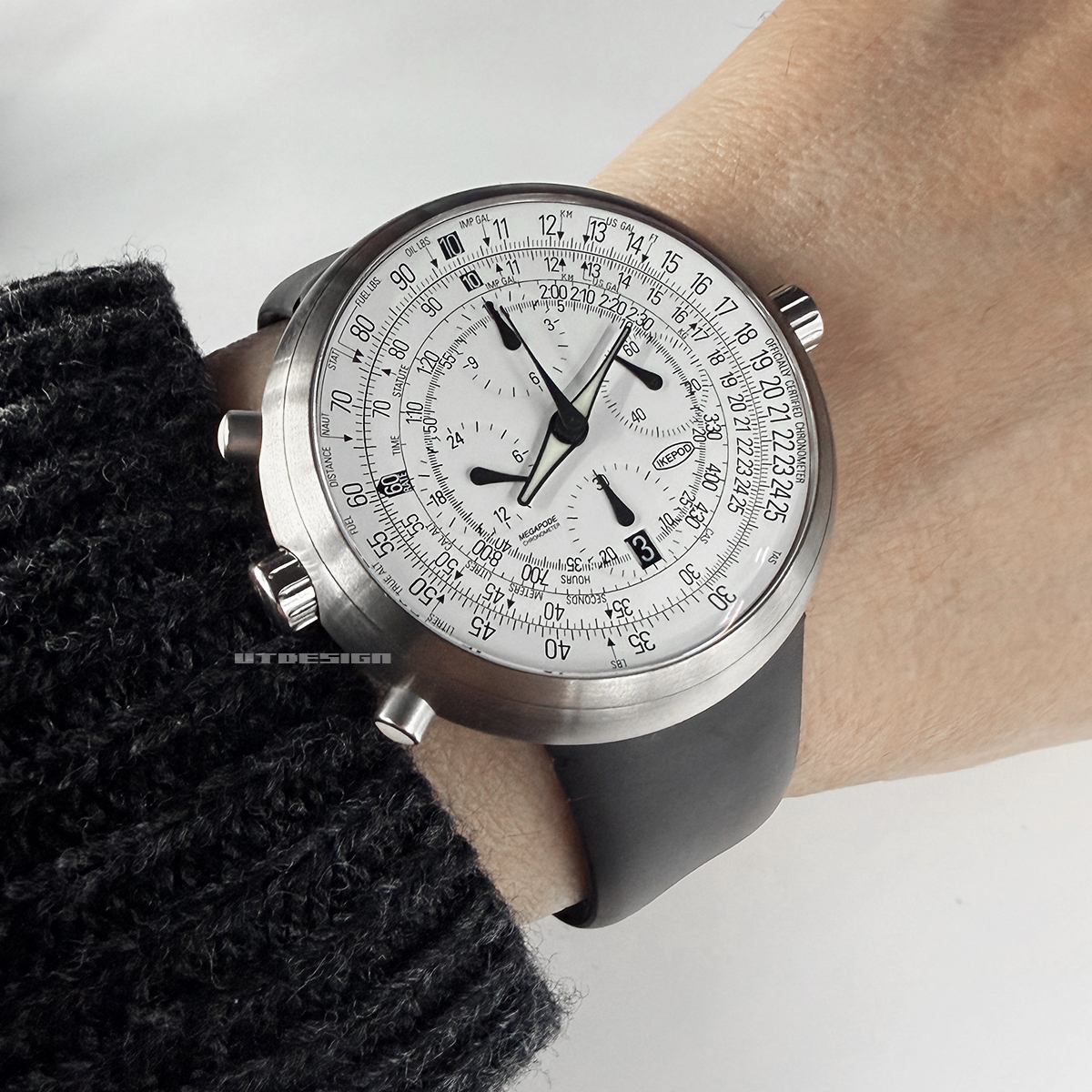 黒xグレーバージョンはガラスの裏面に分の指標を印刷使用しているのですが、このホワイトモデルは表示が重なろうがお構いなしに文字盤に全て印刷しています。外周に印刷されているのは計算尺で3時位置のリューズを回して速度、距離、燃費等が計算できる様になっています。