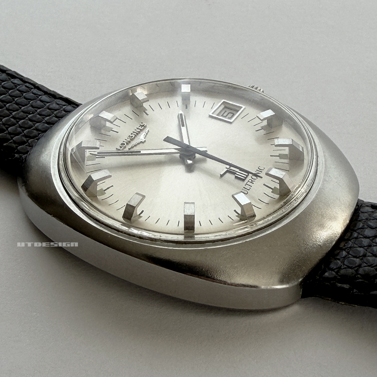 ロンジンの1970年代の音叉時計のULTRONICです。以前にこちらで赤い差し色の効いたシンプルなモデルをご紹介しましたが、今回のモデルはそれとはかなりイメージの異なる、かなり攻めたデザインになってます。