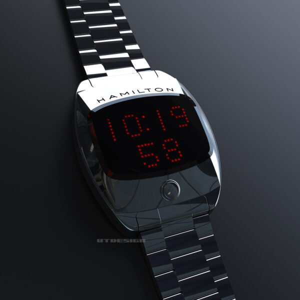 最近、ハミルトンは1970年代のLED時計、Pulsarを色々と復刻していますが(こちらなど)、Pulsarと言えば上の画像の白黒画像にある量産前のプロトタイプモデルがとてもカッコイイので、それの復刻量産妄想CGを作成してみました。