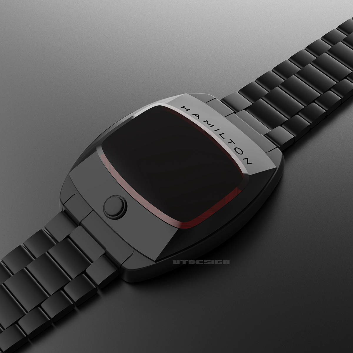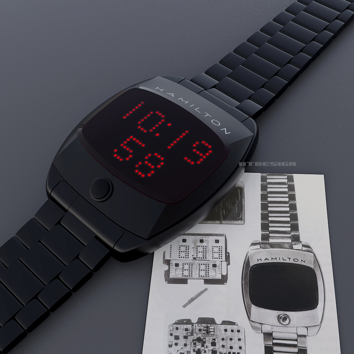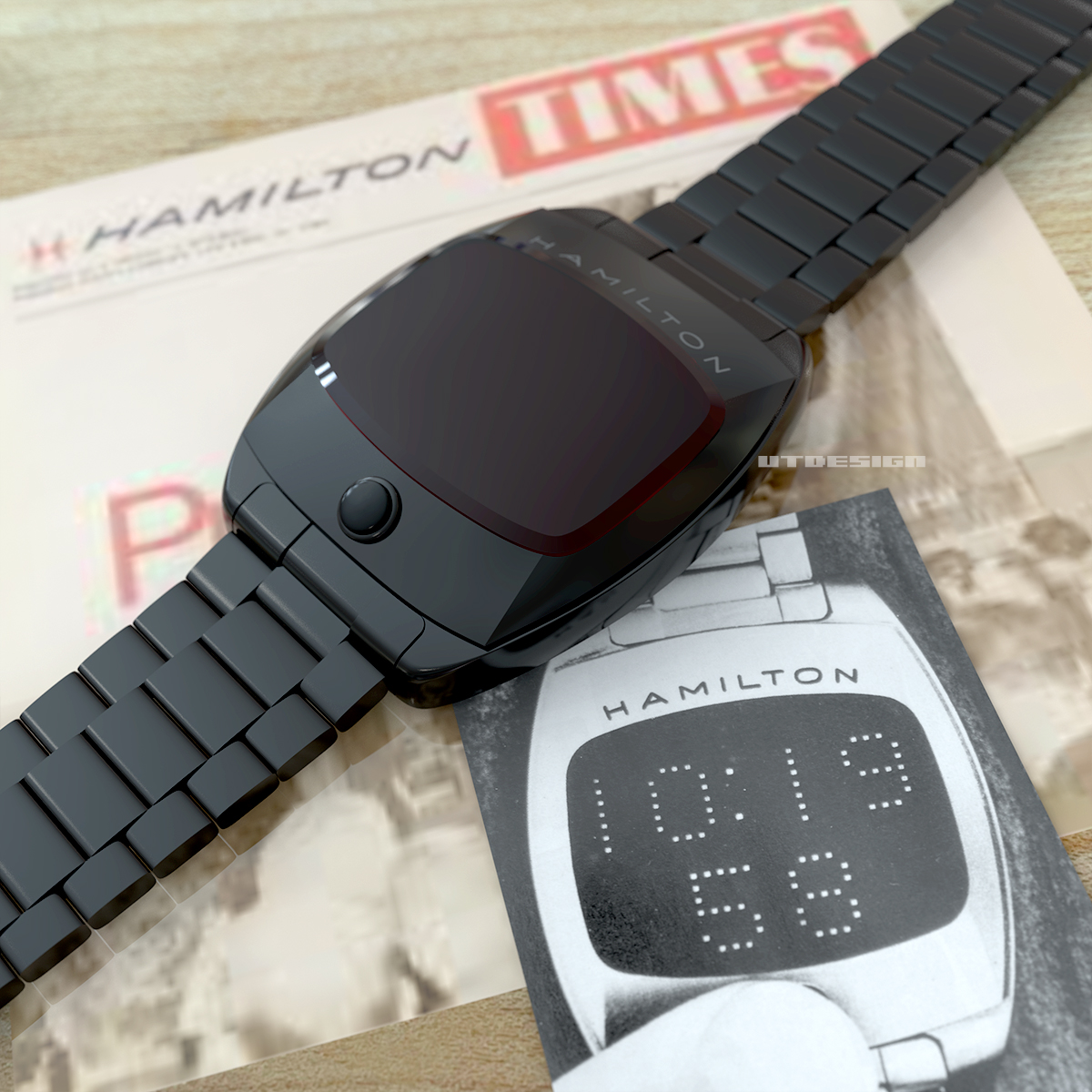 最近、ハミルトンは1970年代のLED時計、Pulsarを色々と復刻していますが(こちらなど)、Pulsarと言えば上の画像の白黒画像にある量産前のプロトタイプモデルがとてもカッコイイので、それの復刻量産妄想CGを作成してみました。