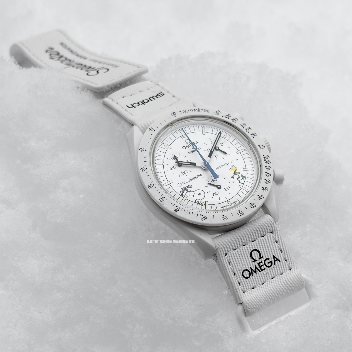 また中華なメーカーがやってくれました。まず、下の画像は今年1月にムーンスウォッチからスヌーピーコラボなモデルが出るらしいとティザー広告が出た時に「私だったらこんな真っ白なモデルが欲しい」と妄想コラ画像を私が作り、こちらのブログ記事にアップしたものです。